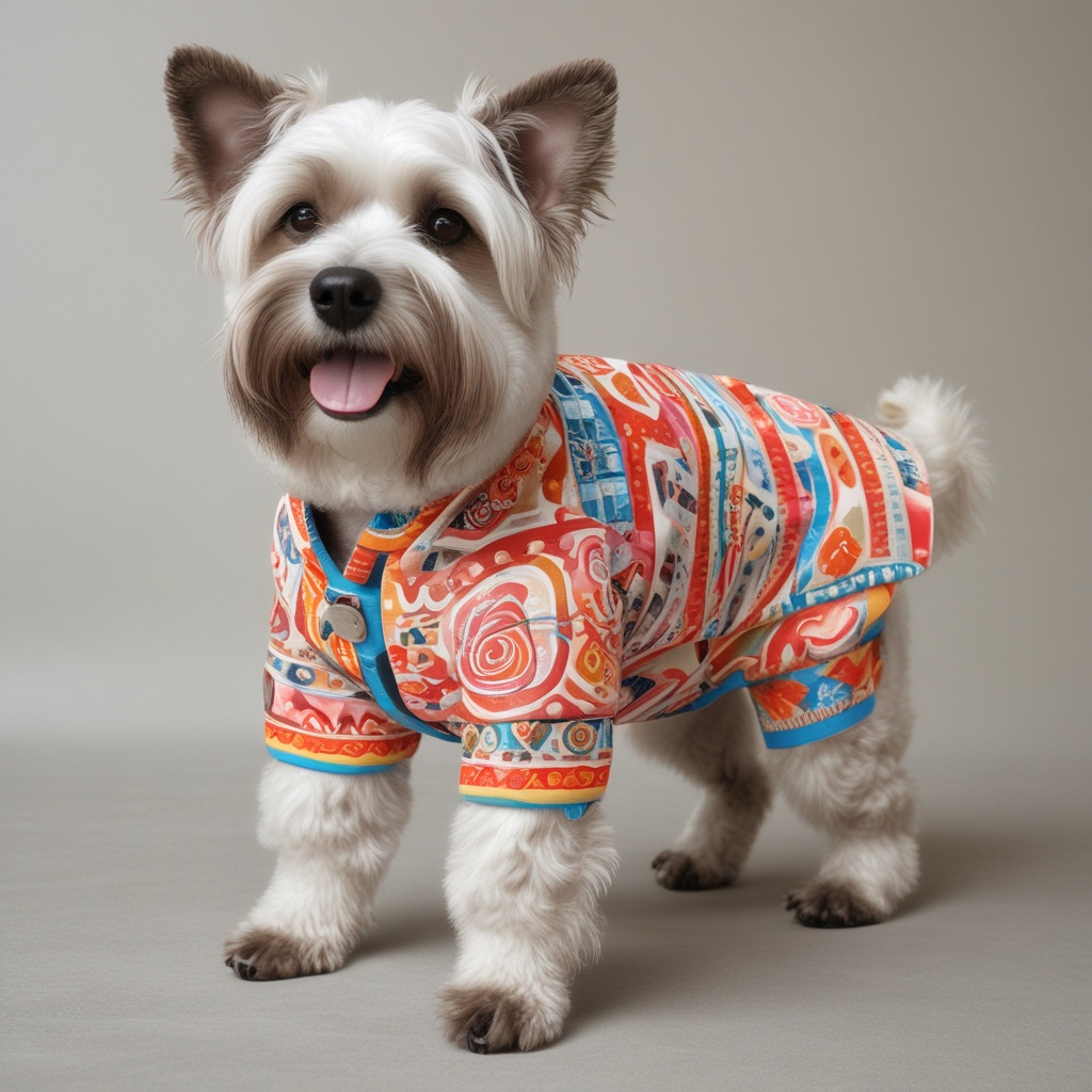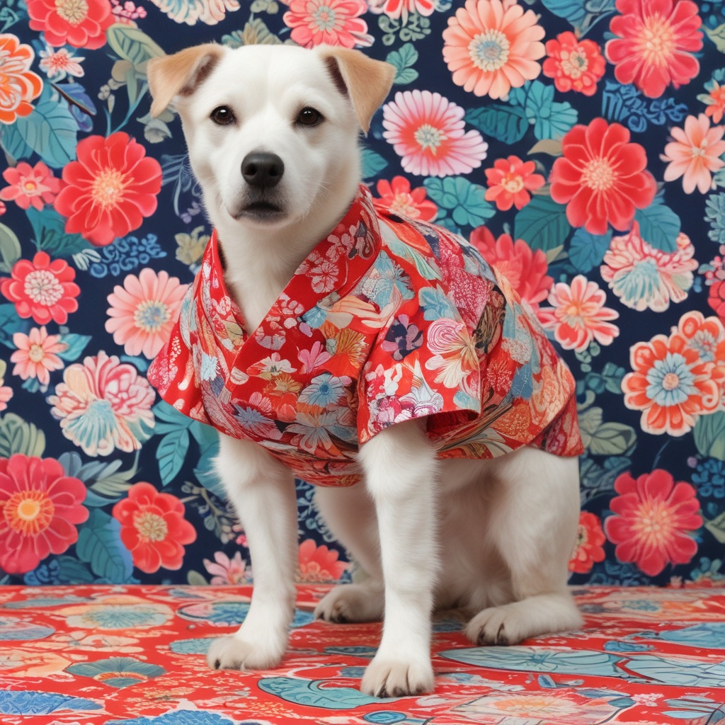 お祭り気分を盛り上げる犬のはっぴ。カラフルで元気なデザイン。